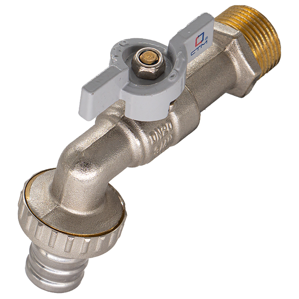 Кран шаровой 1/2″ водоразборный рычаг CTM Стандарт применяется в качестве запорной арматуры на трубопроводах систем водоснабжения, в том числе питьевого. Особенности конструкции, технологии изготовления, применяемых материалов обеспечивают долголетнюю работу шарового крана СТМ Стандарт при эксплуатации в условиях отечественных инженерных систем. Корпус и шток крана изготовлен из высококачественной горячепрессованной латуни с никелированным покрытием. Шаровой затвор изготовлен из высококачественной горячепрессованной латуни, отполирован и покрыт хромом. Герметичность затвора крана соответствует наиболее высоком классу по ГОСТу 9544-2005 — А. Наличие тефлоновых седельных колец и сальниковой прокладки позволяет использовать шаровой кран СТМ Стандарт в системах с рабочей температурой до 150 С. Наличие съемного штуцера с накидной гайкой дает возможность производить его замену в зависимости от диаметра и материала применяемого шланга. Оптимальная длина резьбы обеспечивает надёжное соединение. Кран оснащен алюминиевой ручкой-бабочкой. Техническое обслуживание крана в течение всего срока эксплуатации не требуется.