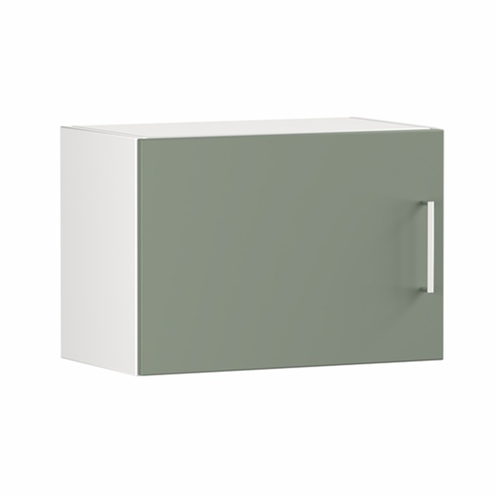 Шкаф над вытяжкой Твэгги Зелёный эстетично завершает композицию гарнитура и служит дополнительным пространством для хранения посуды и кухонной утвари.