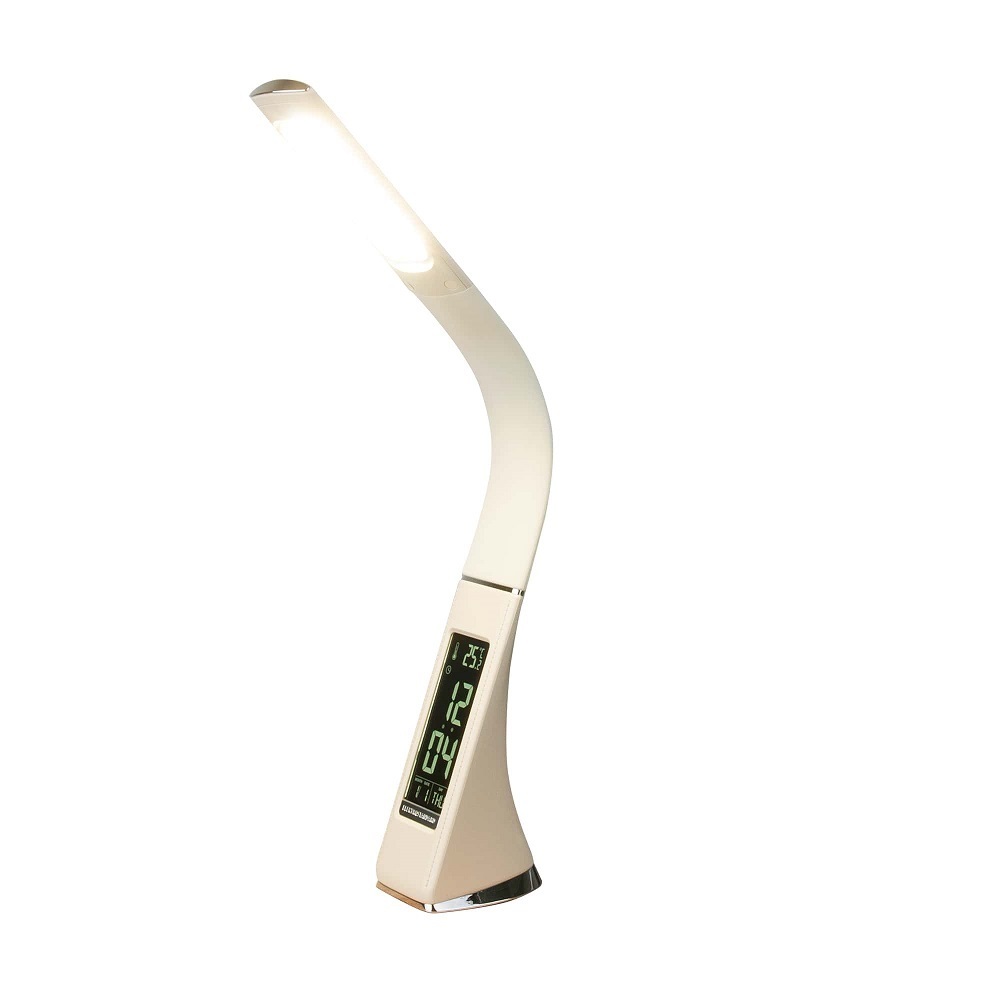 Является важным элементом в создании освещения рабочего пространства и широко используется в жилых и офисных помещениях. Светильник оснащен экономичными SMD светодиодами мощностью 6 Вт, создающие равномерный световой поток 280 Лм и имеющие комфортную цветовую температуру 4200 К. Кроме качественного освещения светильник имеет сенсорное управление, а также антискользящую подставку, будильник, календарь, поворотный механизм, регулятор яркости, термометр и часы. Легкая конструкция из ударопрочного ABS пластика позволяет быстро отрегулировать настольную лампу по высоте и задать необходимый угол наклона, направив световой поток в нужном направлении.