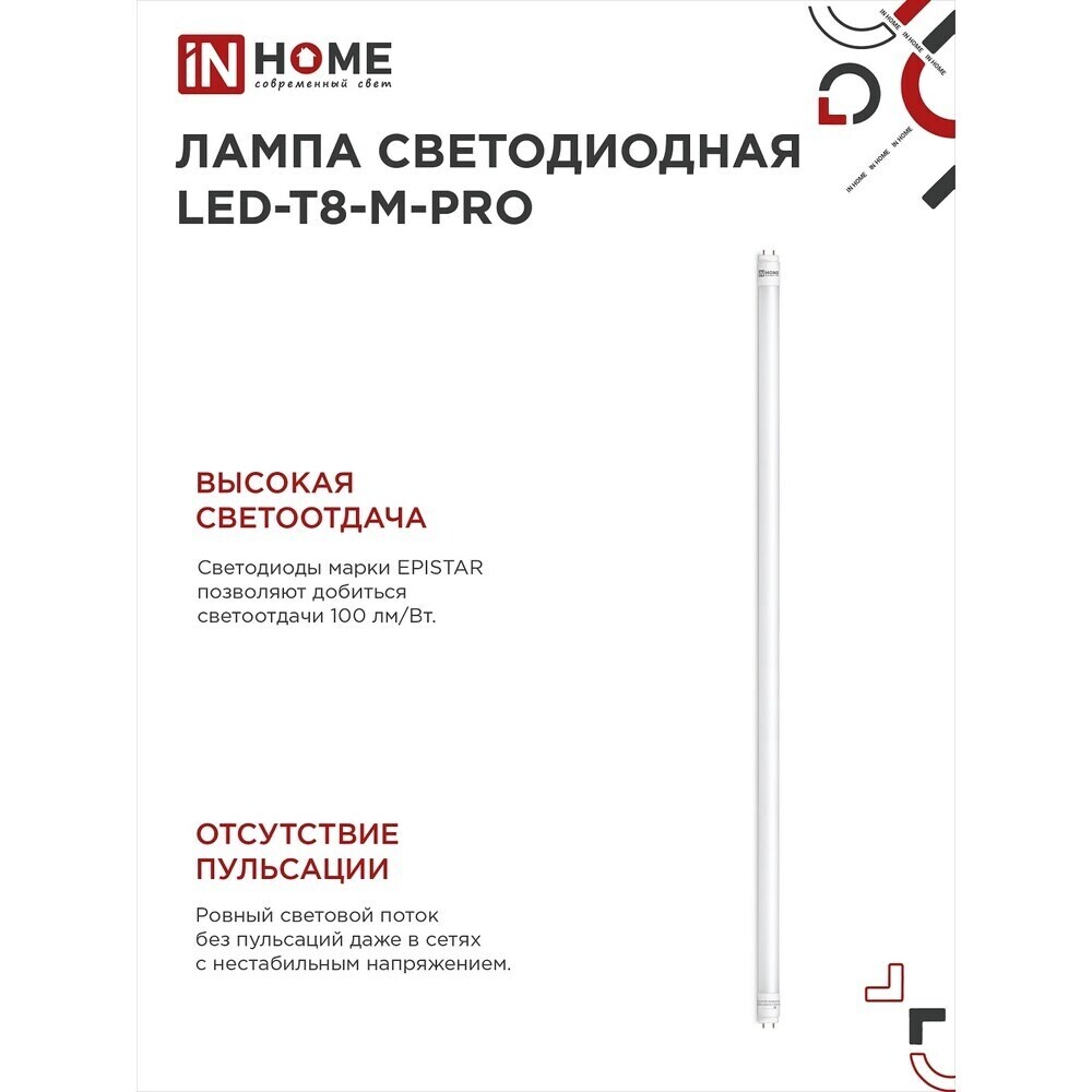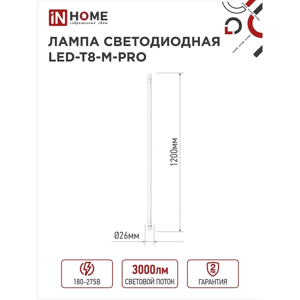Лампа светодиодная IN HOME G13 T8 30 Вт 4000К нейтральный свет 230 В трубка 1200 мм (4690612031019)