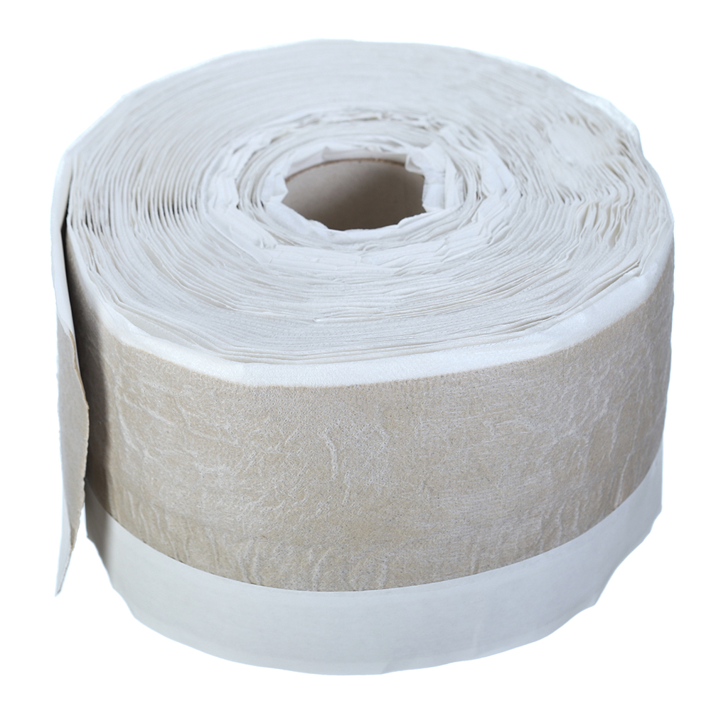 Лента изготовлена из нетканого материала, снабжена двумя полосками самоклеящегося бутилового герметика, размещенного на обеих сторонах.