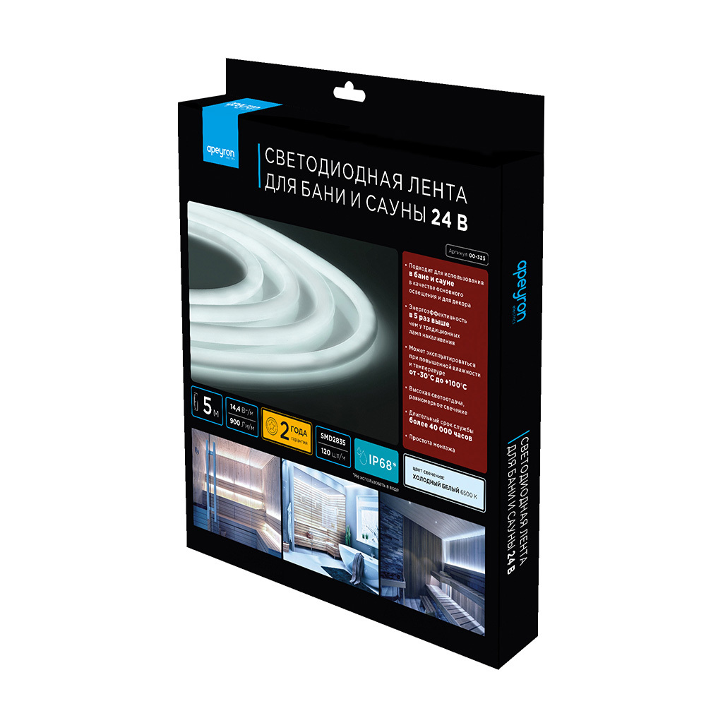 Светодиодная лента для бани и сауны с артикулом 00-325 работает от постоянного тока с напряжением 24В. Благодаря светодиодам smd 2835 излучающим световой поток равный 900 Лм/м лента используется для вспомогательной декоративной подсветки областей интерьерного пространства. Светодиодная лента эквивалентна лампам накаливания мощностью 90 Вт. Данная модель светодиодной ленты обладает холодным белым цветом свечения с цветовой температурой 6500 К. Потребляемая мощность светодиодной ленты равна 14,4 Вт на один метр. Степень защиты этого изделия соответствует стандарту IP68. Герметичная силиконовая оболочка позволяет использовать светодиодную ленту в банях и саунах. Не использовать в воде! Отрезать светодиодную ленту можно через каждые 50 мм. В комплект поставки входит: светодиодная лента 5 м, крепеж 10 шт., заглушки 2 шт. в сборе +1 шт.