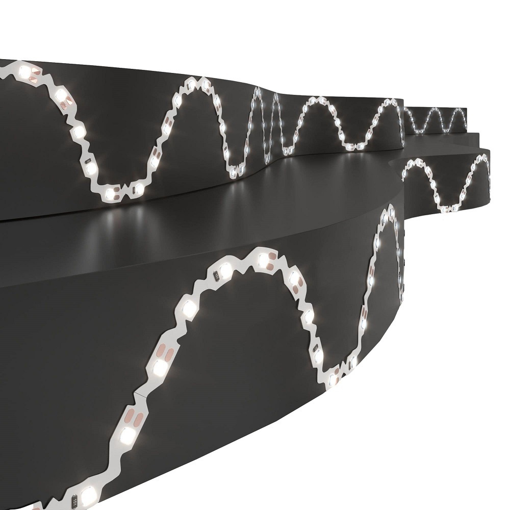 Дизайнерская гибкая лента 12 В используется для рекламных вывесок, а также для создания световых композиций в современных интерьерах и экстерьерах. Лента имеет фигурную плату, позволяющей изгибать ее на плоскости по радиусу и под углом. Такая лента может использоваться для установки на извилистых поверхностях для подсветки предметов сложных форм. Лента поставляется в рулоне с припаянным выводом проводов с цветовым обозначением для удобного подключения. Длина ленты составляет 5 м. Светодиодную ленту можно укоротить, отрезав нужную часть в местах для реза, а при необходимости удлинить, используя коннекторы. Гибкость ленты и надежная клеевая основа позволяют устанавливать ленту на различные поверхности. Для подключения светодиодной ленты к сети питания используются понижающие трансформаторы, преобразующие 220 В переменного тока в 12 В постоянного тока (AC 220 — DC 12V). Широкий диапазон температуры окружающей среды позволяет использовать ленту в неотапливаемых помещениях при температуре до -25°С. Срок службы светодиодов составляет 50000 часов.