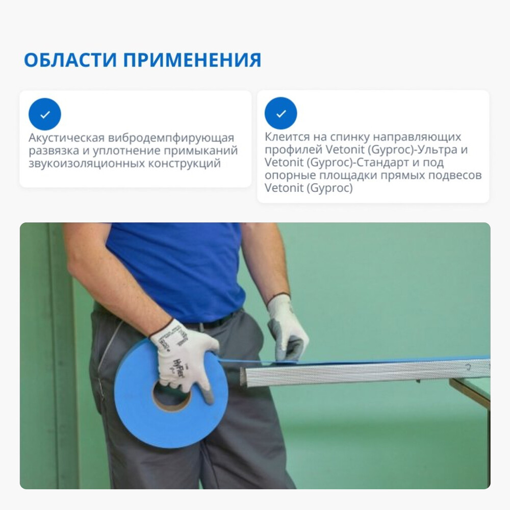 Уплотнительная поризованная лента из вспененного полиэтилена с акриловым клеевым слоем на водной основе. Обладает вибродемпфирующими, а также оптимально подобранными клеевыми свойствами. Синий цвет ленты позволяет легко идентифицировать ее наличие в конструктивах. Область применения – акустическая вибродемпфирующая развязка и уплотнение примыканий звукоизоляционных конструкций перегородок, потолков и облицовок в местах сопряжения с другими конструкциями. Обеспечивает звукоизоляционные характеристики конструкций, компенсацию неровностей и подвижек сопрягаемых конструкций. Защищает поверхность профилей, на которую приклеена лента, от коррозии при контакте с влажными основаниями.