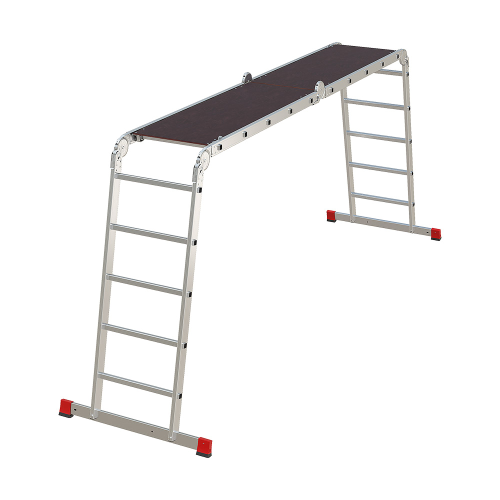 Предназначена для профессионального применения. Высокопрочная лестница «4 в 1»: приставная, Г-образная с опорой на стену, двухсторонняя стремянка, помост со съемным настилом в комплекте. Увеличенная ширина для свободы перемещений.