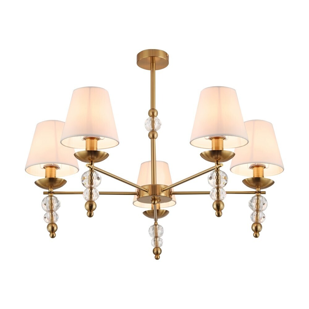 Абажур светильника выполнен из белой ткани. Металлическая арматура в цвете латунь обрамлена хрустальными бусинами. Источник света — лампы с цоколем Е14. Степень защиты — IP20.