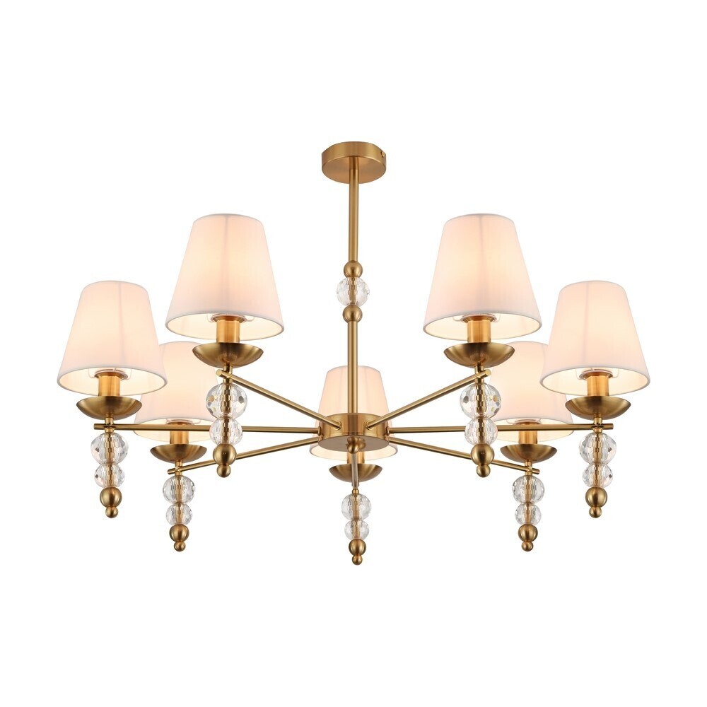 Абажур светильника выполнен из белой ткани. Металлическая арматура в цвете латунь обрамлена хрустальными бусинами. Источник света — лампы с цоколем Е14. Степень защиты — IP20.