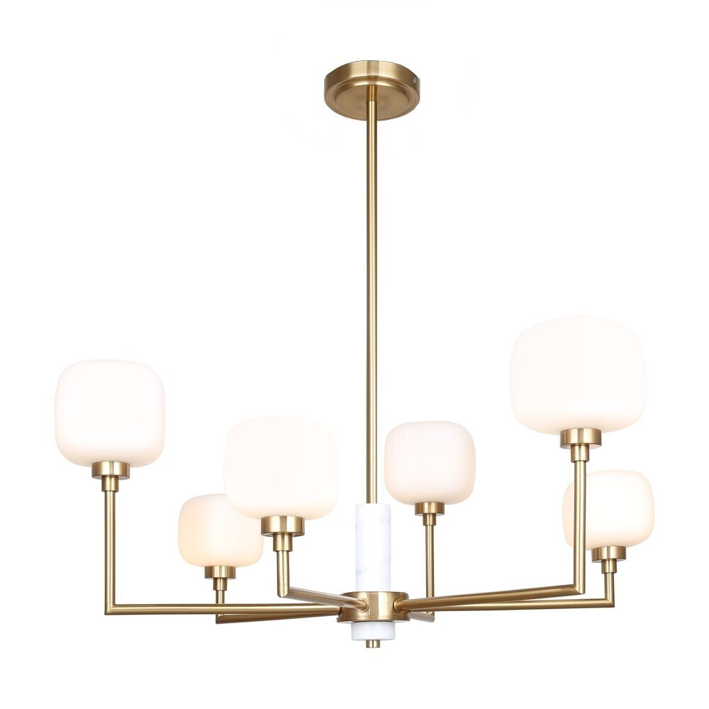 Светильник имеет металлическую графичную арматуру цвета латунь. Плафоны из белого матового стекла в необычной форме округлых кубов закреплены на разной по высоте комбинации. Светильник мягко и равномерно освещает помещение. Источником света служит лампа с цоколем G9.
