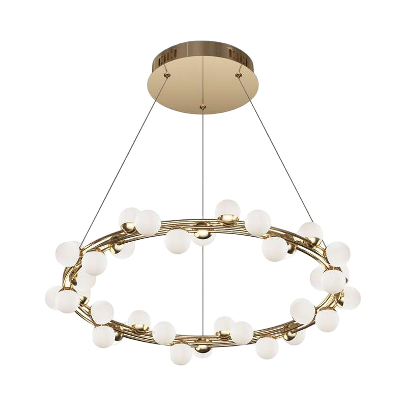 Предназначена для освещения внутренних помещений. Широкая окружность, обрамленная «молекулами» света, обеспечивает максимально равномерное и яркое освещение пространства. Одна из характерных черт подобных светильников—невесомость конструкции. За счет тонких, практически невидимых тросов, которые регулируются по высоте, создается ощущение, что люстра парит в воздухе. Металлическая золотая арматура и матово-белые миниатюрные плафоны с легкостью дополнят любую палитру, а представленные в коллекции подвесная люстра и бра станут готовым ансамблем для освещения гостиной, спальни, прихожей.