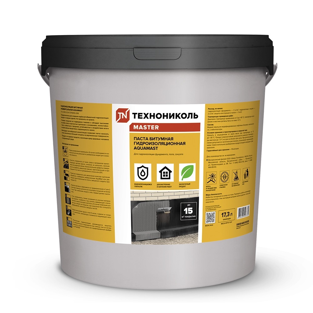 Пастообразная мастика на водной основе предназначена для надежной гидроизоляции фундаментов и полов. Создает единый бесшовный гидроизоляционный слой без стыков, надежно защищает поверхность от влаги и агрессивных веществ, содержащихся в грунте. Экологична и безопасна в применении — не содержит растворителей и не имеет запаха. Наносится кистью или шпателем, не требует специальных навыков. Мастика имеет коричневый цвет, при высыхании становится черной, что позволяет легко определить готовность гидроизоляции. Благодаря пастообразной консистенции наносится на вертикальные поверхности за 1 раз при толщине слоя до 3 мм. Мастика Aquamast также подходит для антикоррозионной и противокапиллярной защиты бетона. Не подвержена гниению. Применяется при температуре от 0°С до +40°С. Высыхает за 8 часов – можно выполнить гидроизоляцию за 1 день. Отличается экономичным расходом: одного ведра весом 15 кг достаточно для гидроизоляции поверхности площадью до 15 м2..