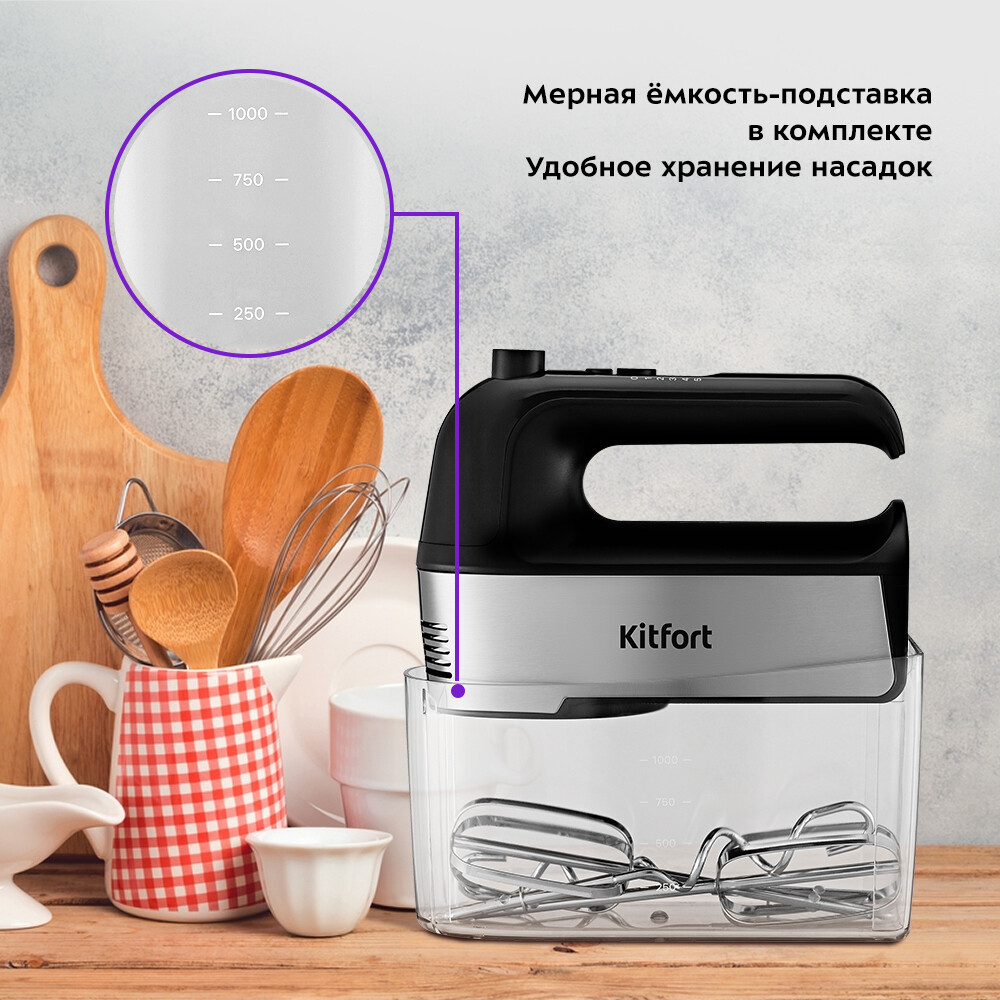 Kitfort КТ-3409 — ручной миксер, который поможет смешать ингредиенты, взбить яичный белок, приготовить соус, замесить тесто. Прибор оснащен двумя комплектами насадок: венчики для взбивания ингредиентов, а крюки подойдут для замеса более плотного теста. Миксер оснащен 5 скоростями работы и турборежимом. Регулятор скорости и кнопка турборежима расположены на ручке миксера, поэтому переключить скорость во время работы будет легко и удобно, готовьте любимые блюда с удовольствием. Мерная емкость-подставка миксера КТ-3409 поможет отмерить нужное количество ингредиентов, а также на нее можно ставить устройство во время перерыва, а для удобного хранения в нее помещаются все насадки. Миксер КТ-3409 прост в управлении: установите подходящую пару насадок, выберите нужную скорость с помощью регулятора и приступайте к приготовлению любимых блюд.