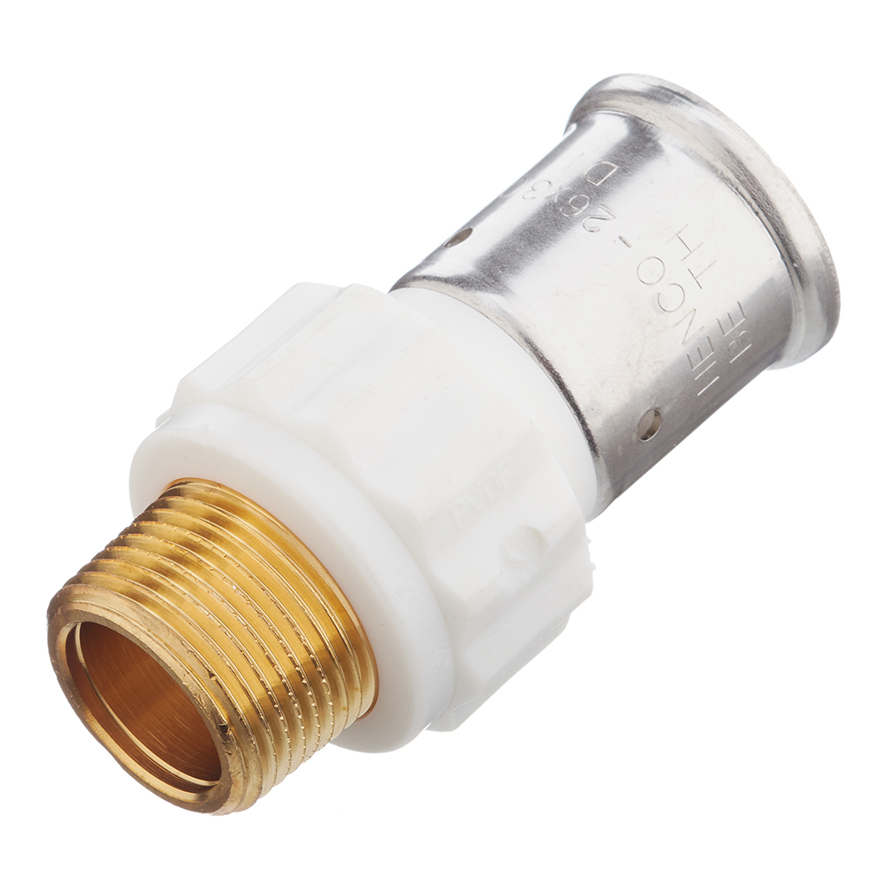 Предназначена для присоединения к металлопластиковым (металлополимерным) трубам и трубам из сшитого полиэтилена элемента системы, имеющего наружную резьбу.
