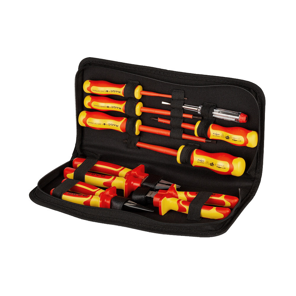 Набор предназначен для работы с оборудованием под высоким напряжением до 1000 В. Используется для широкого спектра слесарных и монтажных работ, перекусывания проводов и проволоки, а также для удаления изоляции с проводов, для выполнения сборочных, разборочных работ, для монтажа и демонтажа резьбовых соединений: шурупов, саморезов и т. д. Рабочая часть губцевого инструмента выполнена из прочной хромованадиевой стали с двусторонней полировкой, а диэлектрических отверток из стали S2, которая способна выдерживать продолжительные нагрузки. Покрытие рукояток исключает проскальзывание инструмента в руке, обеспечивая комфорт и безопасность во время работы. Подходит для профессионального использования. Набор поставляется в легком нейлоновом кейсе, в котором удобно хранить и транспортировать инструмент.