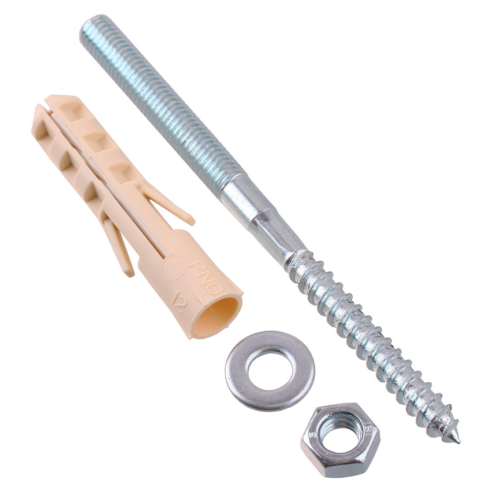 Комплектация: Шпилька сантехническая М8х120 ZN — 2 шт; Дюбель нейлоновый распорный 12х60 — 2 шт; Шайба DIN 125A М8 ZN — 2шт; Гайка DIN 934 М8 ZN — 2 шт.