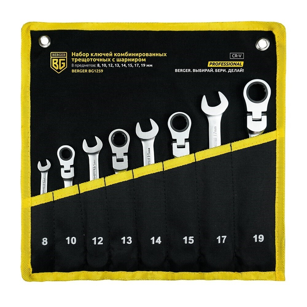 Набор комбинированных ключей с трещоткой и шарниром Berger 8-19 мм (BG1259) (8 шт.)