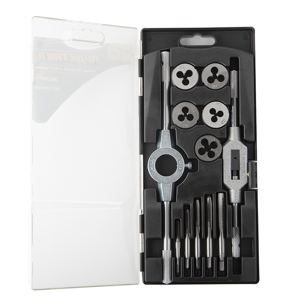 Комплектация: плашки и метчики: М3,0х0,5 мм, М4,0х0,7 мм, М5,0х0,8 мм, М6,0х1,0 мм, М8,0х1,25 мм, плашкодержатель, метчикодержатель.