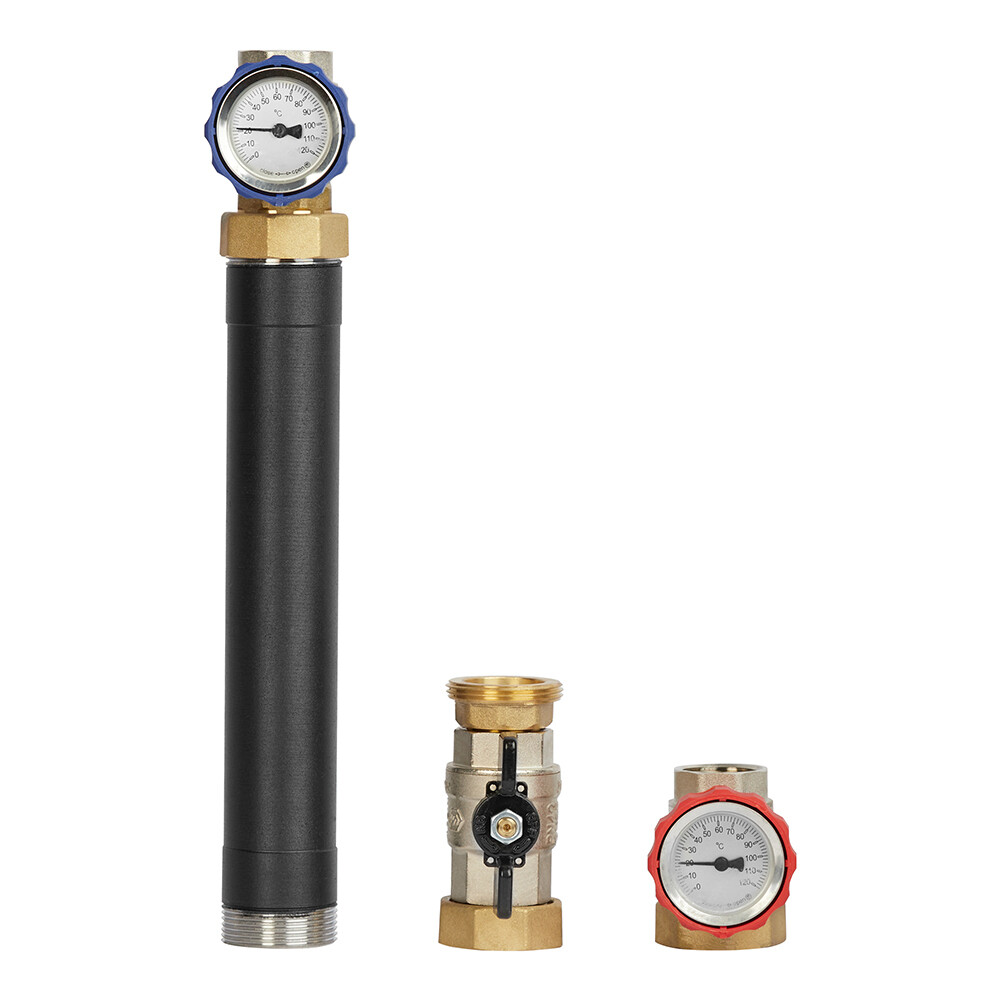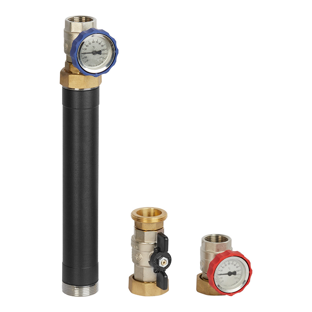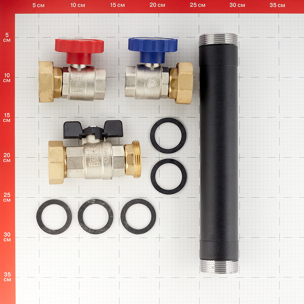 Насосная группа с прямым контуром (подача теплоносителя осуществляется напрямую, без подмешивания) состоит из трех запорных шаровых кранов и одного обратного клапана, двух термометров подающей и обратной линии и блочной теплоизоляции.