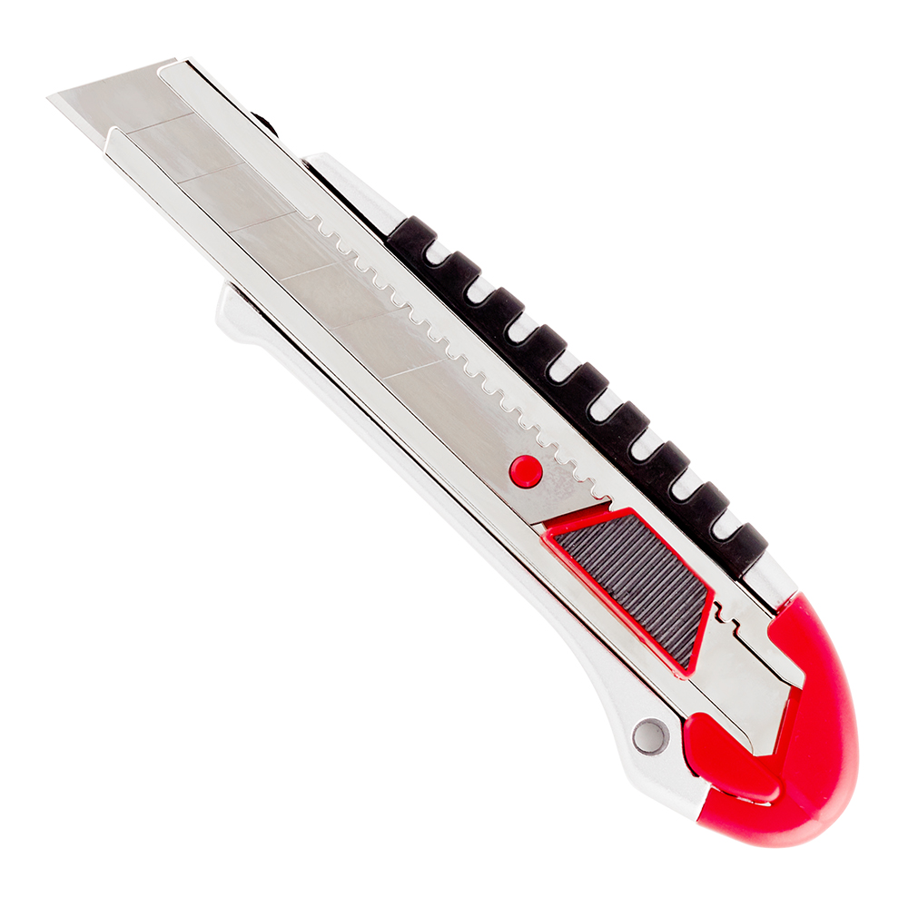 Предназначен для разрезания различных строительных материалов, таких как гипсокартон, аквапанель, гофрокартон, обои, различные виды пленки, пенополистирол и др. Нож оснащен механизмом фиксации лезвия с автоблокировкой и дополнительным винтовым стопором. Имеет металлический корпус с прорезиненными вставками.