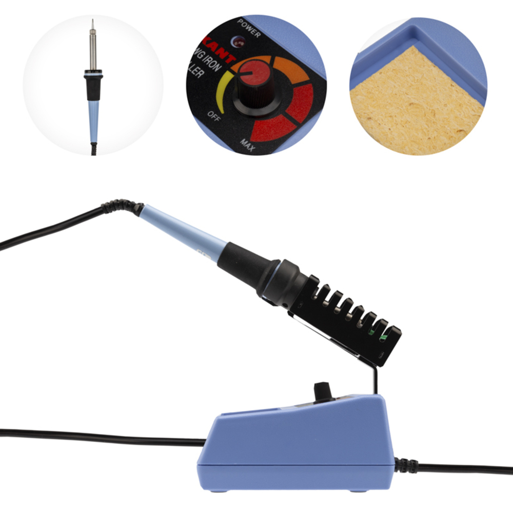 Паяльная станция предназначена для ручного монтажа радиоэлементов. Подходит как для любительского, так и для профессионального использования. Температура нагрева жала варьируется в диапазоне от 160-480°C и регулируется с помощью механического потенциометра. При необходимости жало можно заменить. Станция комплектуется паяльником, держателем паяльника, а также губкой для очистки жала в ложементе. Паяльник оснащен нихромовым нагревателем и кнопкой с индикатором включения. Потребляемая мощность — AC 230В/48 Вт.