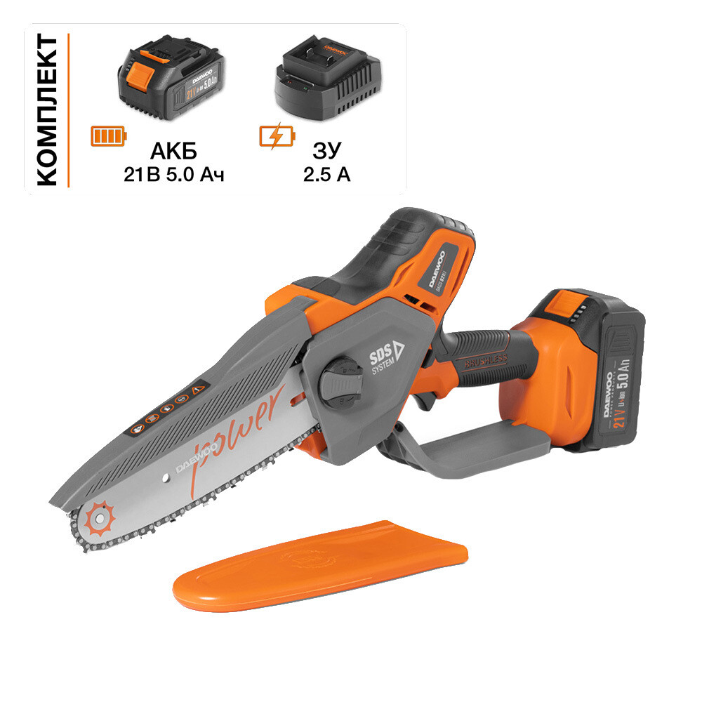 Пила цепная аккумуляторная Daewoo 21 В 8″ шаг 1/4″ паз 1,1 мм 48 звеньев Li-Ion 5Ач 1 АКБ и ЗУ (DACS 821Li SET)