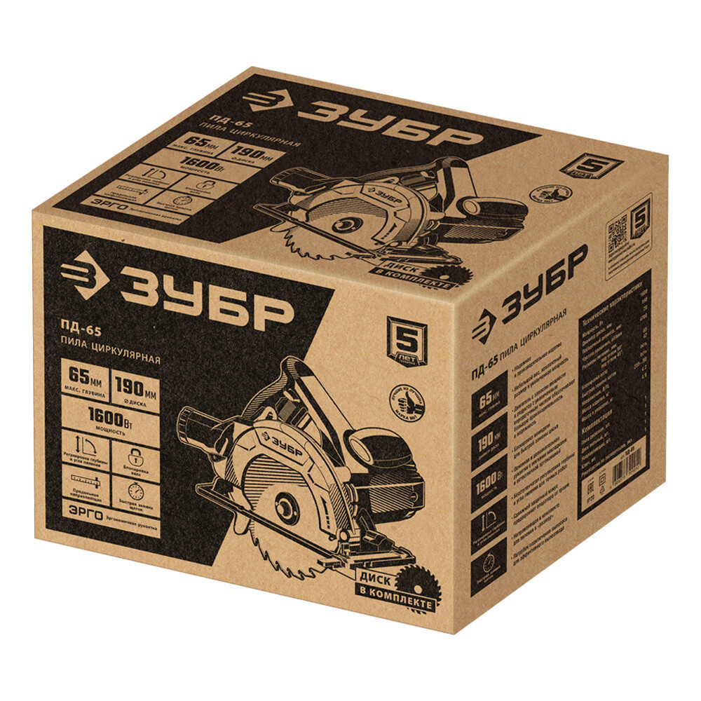 Пила дисковая электрическая Зубр ПД-65 1600 Вт 190 мм