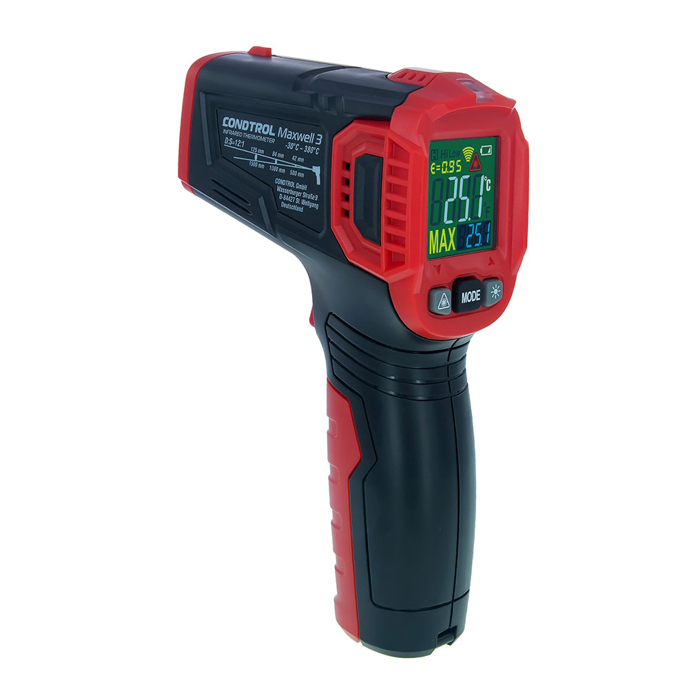 CONDTROL Maxwell 3 – инфракрасный пирометр, предназначенный для мониторинга тепловых потерь, поиска мостиков холода, зон утечки тепла, засоров в системе теплоснабжения, перегрева подвижных деталей в автомобилях и механизмах. Диапазон измерений температуры поверхности от – 30 °С до 380°С.