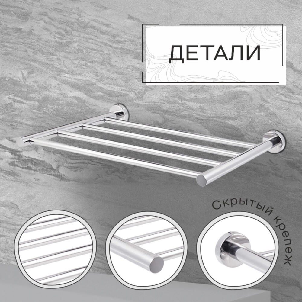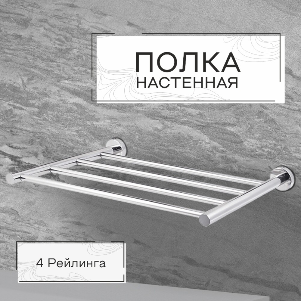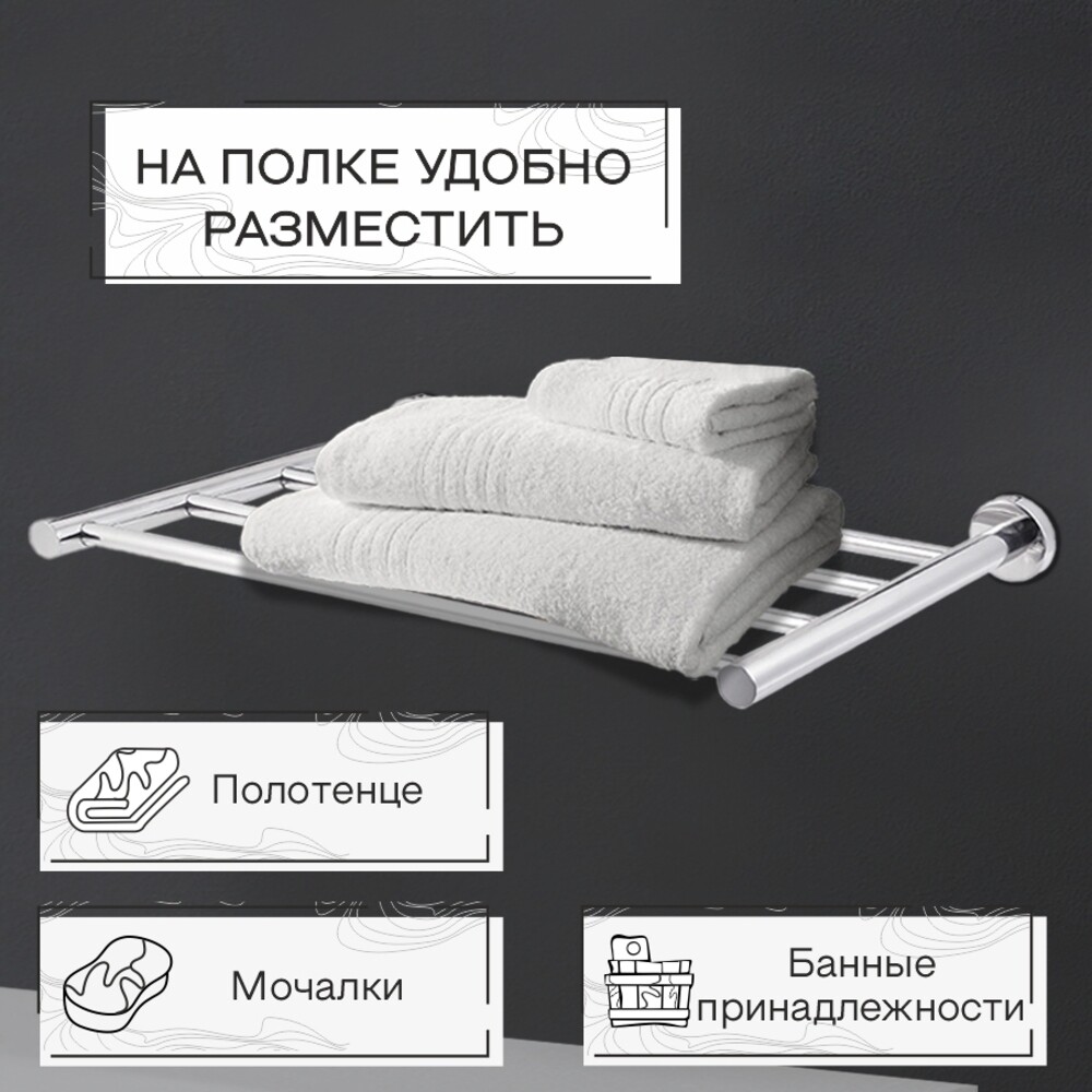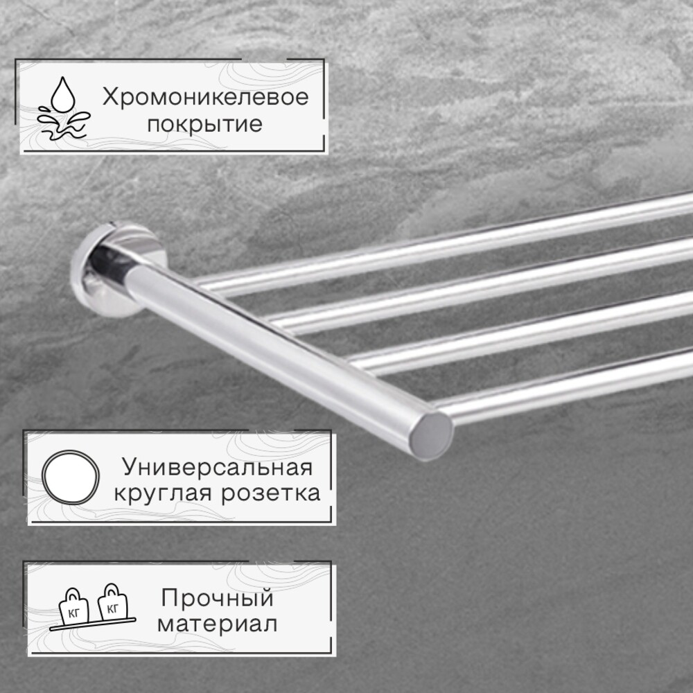 Полка настенная на круглой розетке с полотенцедержателем в цвете хром универсальна, долговечна и устойчива к коррозии. Стильный и функциональный аксессуар для любой ванной комнаты.