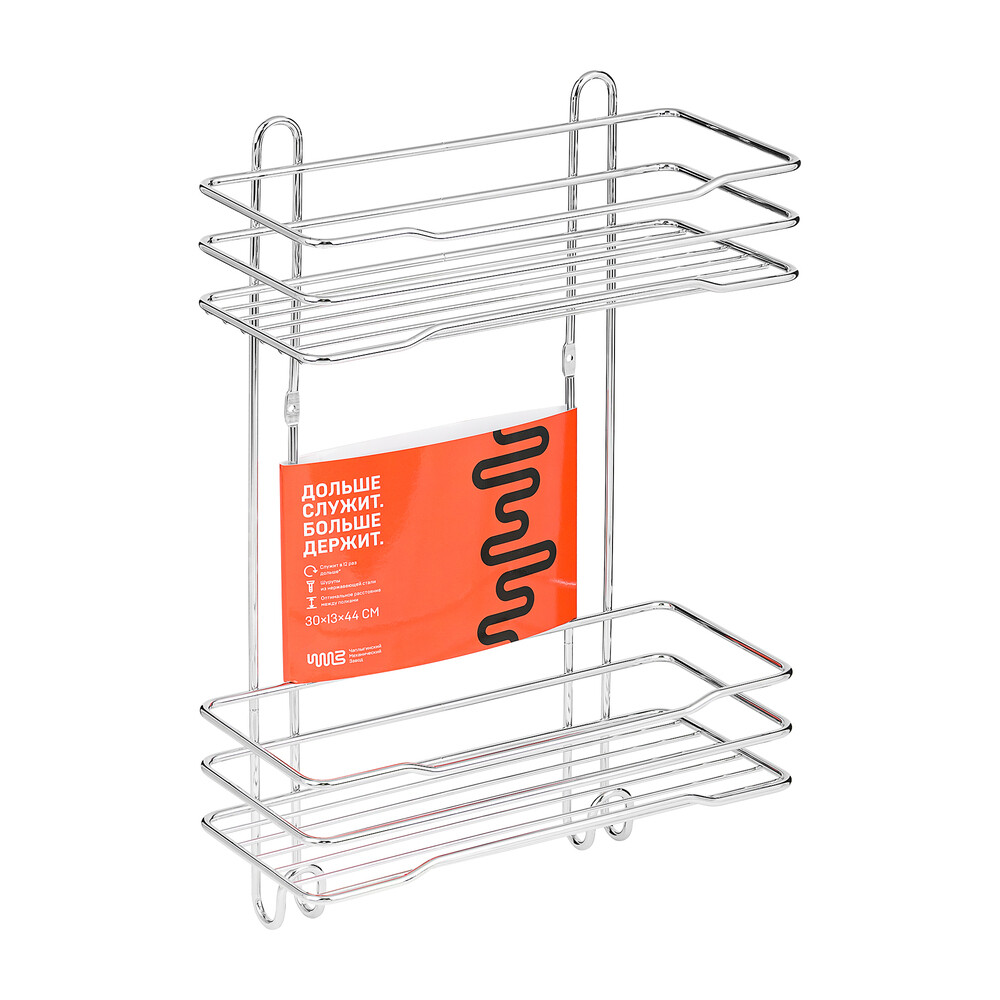 Двухъярусная прямая полка с крючками из стали с гальваническим покрытием цвета хром.
