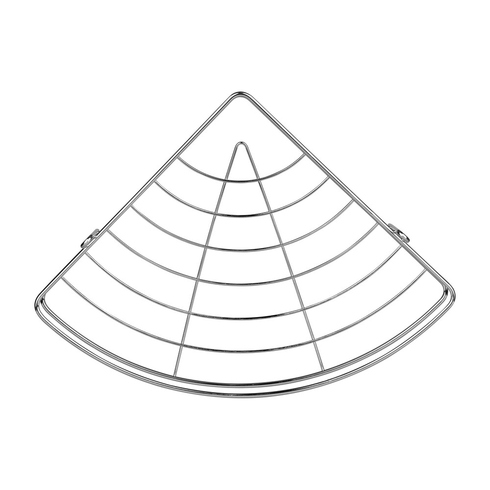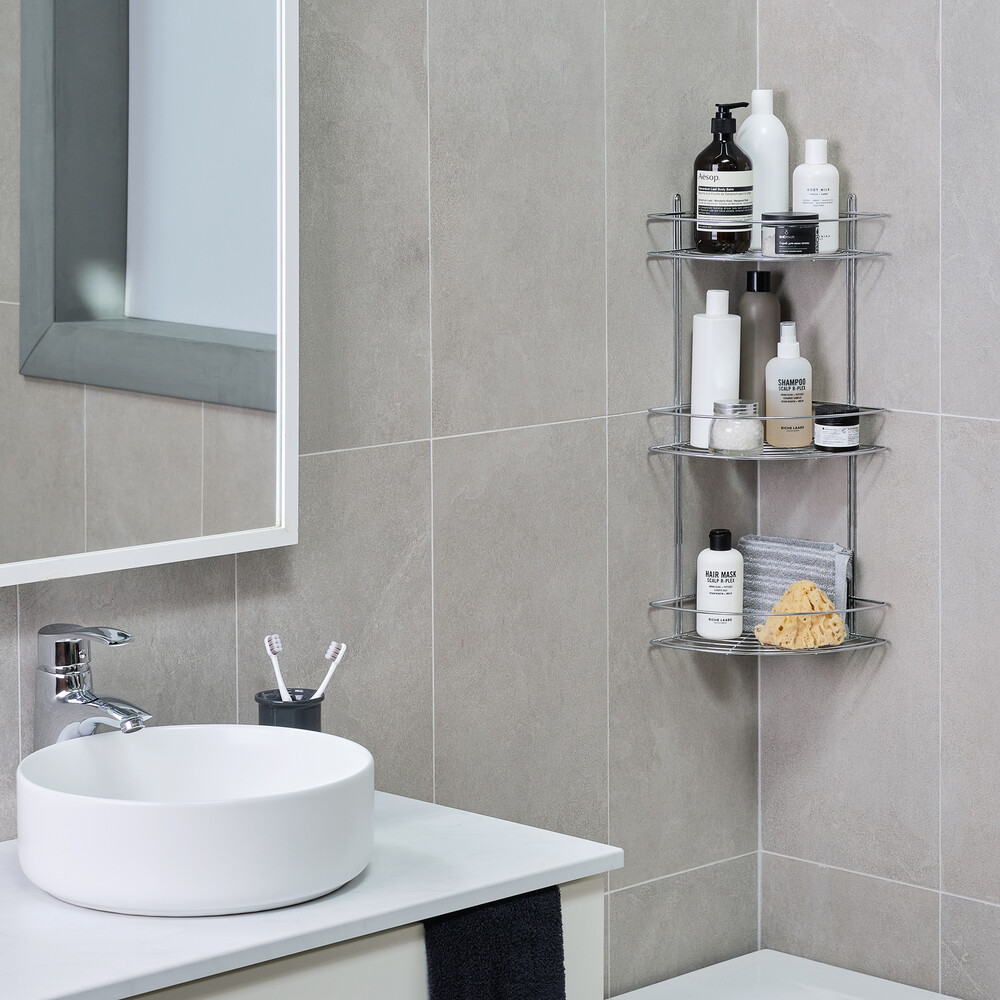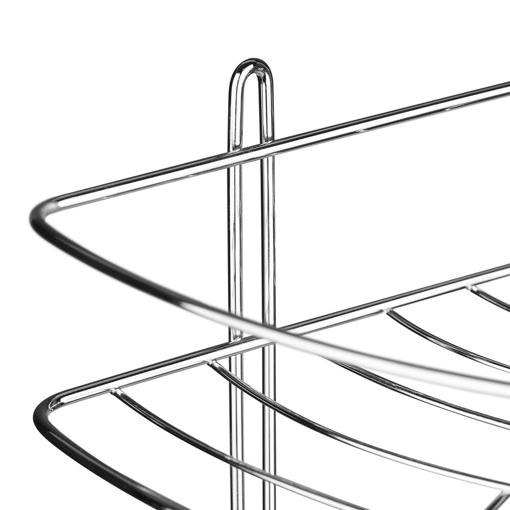 Трехъярусная угловая настенная полка из стали цвета хром.