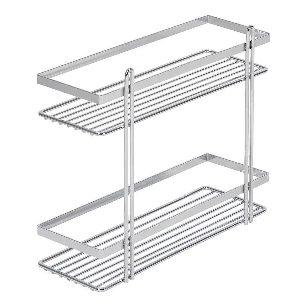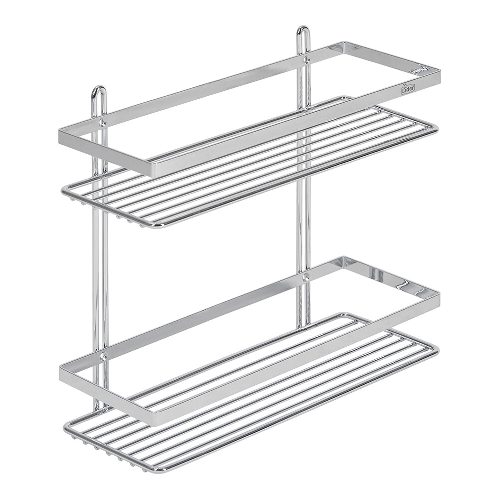 Полка прямая двухъярусная плоский борт, изготовлена из высококачественного металла с хромированным покрытием.