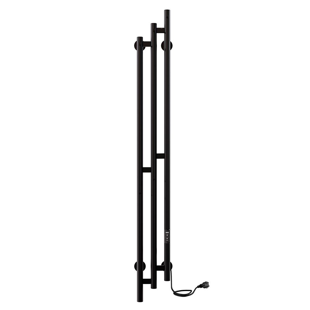 Электрический полотенцесушитель Indigo Sky в цвете «Черный Муар». Уникальный дизайн, состоящий из трех круглых вертикальных стоек, асимметрично соединенных прямоугольными перекладинами, придаст вашей ванной комнате современный вид. Полотенцесушитель черный матовый покрыт безопасным порошковым полимером, что делает его устойчивым к повреждениям и облегчает уход за ним. Матовое покрытие с легкой песочной текстурой исключает следы от отпечатков пальцев, а черный цвет создает эффектный контраст и идеально сочетается с остальной сантехникой темных оттенков. Крючки на полотенцесушителе предусмотрены для дополнительного размещения текстильных изделий.