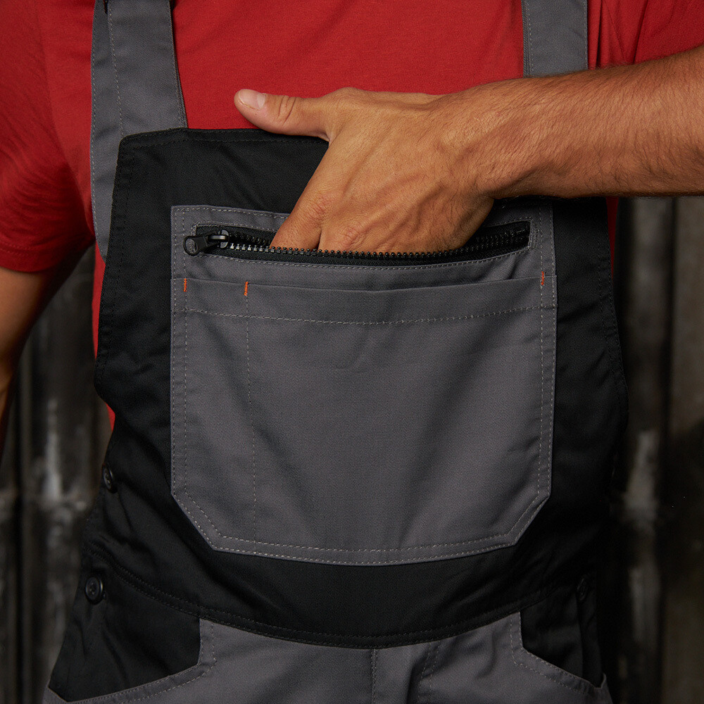 Большое количество накладных и прорезных карманов – 10 карманов, включая один карман для линейки и усилительные накладки в области коленей в виде карманов для наколенников, застегивающихся на контактную ленту сбоку кармана.