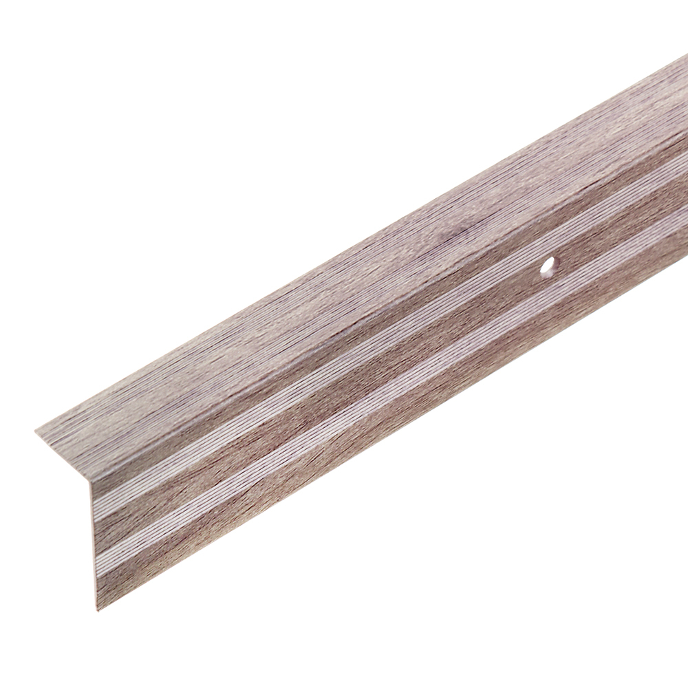 Порог угловой. Предназначен для фиксации краев напольных покрытий на ступенях, защиты угловых поверхностей ступеней, а также для препятствия скольжению. Комплектуется саморезами и дюбелями.
