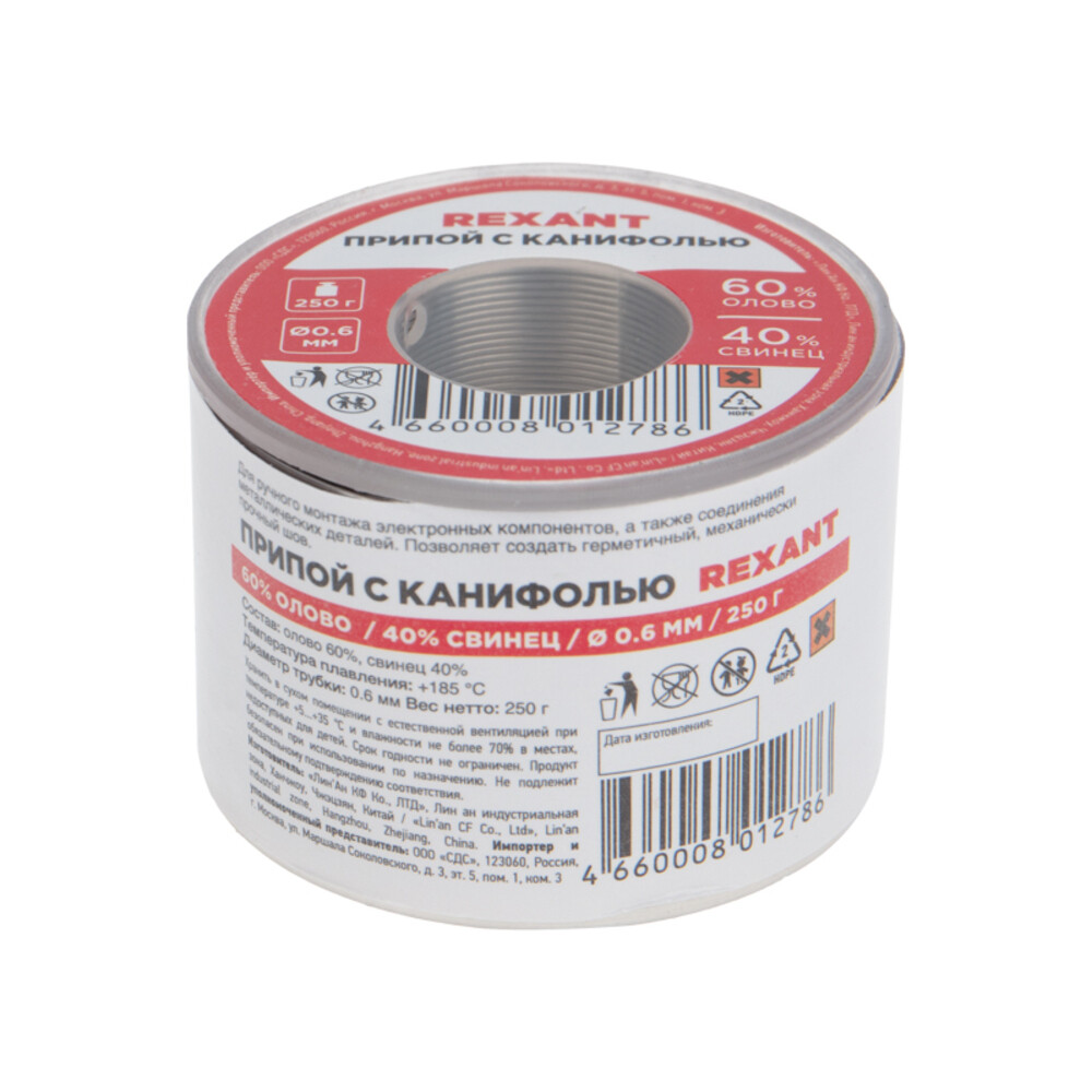Припой Rexant d0,6 Sn60 Pb40 Flux 2.2% с канифолью 250 г (09-3311)