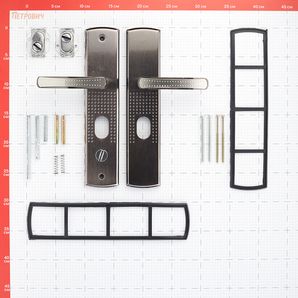 Комплектация: две ручки, винтовые стяжки, пластиковые прокладки и квадратный штырь (8х8 мм) 110 мм, комплекты стержней для автоматических и не автоматических замков.