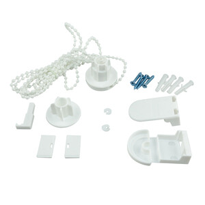 Алюминиевая труба с тканью – 1 шт.; Механизм с цепочкой – 1 шт.; Упорный валик – 1 шт.; Боковые кронштейны – 2 шт.; Отвесная планка – 1 шт.; Крепежный комплект – 1 шт.; Фиксатор – 1 шт.; Ограничитель размотки ткани – 2 шт.; Заглушка для саморезов – 2 шт.