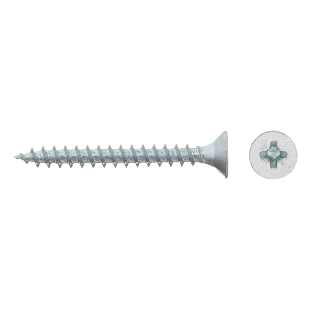 Саморезы имеют потайную головку с крестообразным шлицем PZ 2 и острый наконечник. Производятся из оцинкованной стали.