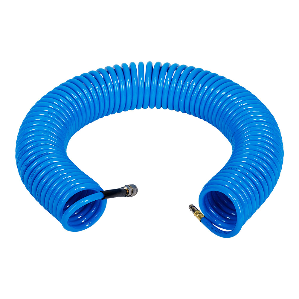 Шланг спиральный служит удлинителем между компрессором и рабочим инструментом. Изготовлен из полиуретана. Достаточная длина оснастки позволяет осуществлять работы на нужном расстоянии от компрессора. Шланг оснащен фитингами рапид.