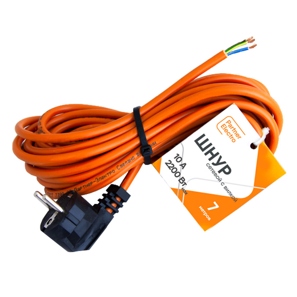 Шнур сетевой с вилкой 7,0 м ПВС-ВП 3х0,75 кв.мм 10 А Партнер-Электро оранжевый (ЦБ-00013572/4576)