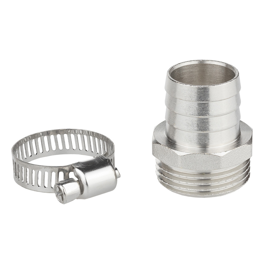 Комплект для подключения садового шланга 3/4″ состоит из штуцера и обжимного хомута.