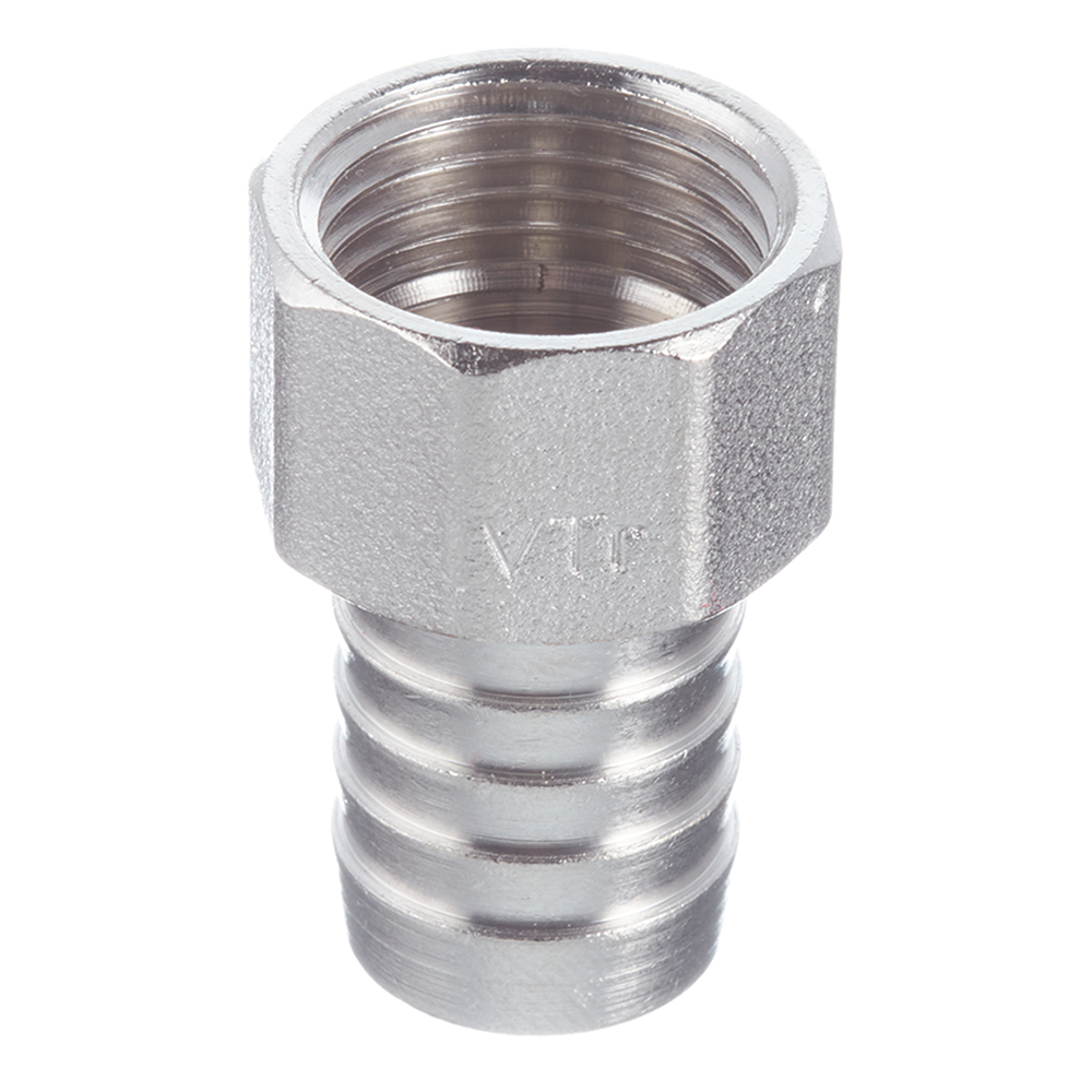 Предназначен для подключения к водозапорной арматуре, непосредственно к трубопроводам поливочного шланга. Изделие можно применять также в других системах с неагрессивной к используемым материалам рабочей средой (горячая вода, незамерзающий теплоноситель, сжатый воздух и т.д.). Фитинг выполнен из сантехнической латуни CW617N, защищенной никелевым гальванопокрытием. Присоединительный патрубок снабжен цилиндрической трубной наружной резьбой с насечками для лучшего удержания герметика. Штуцер для шланга имеет конфигурацию, эффективную для его фиксации. Присоединение шлангов необходимо производить с помощью плоских обжимных хомутов.