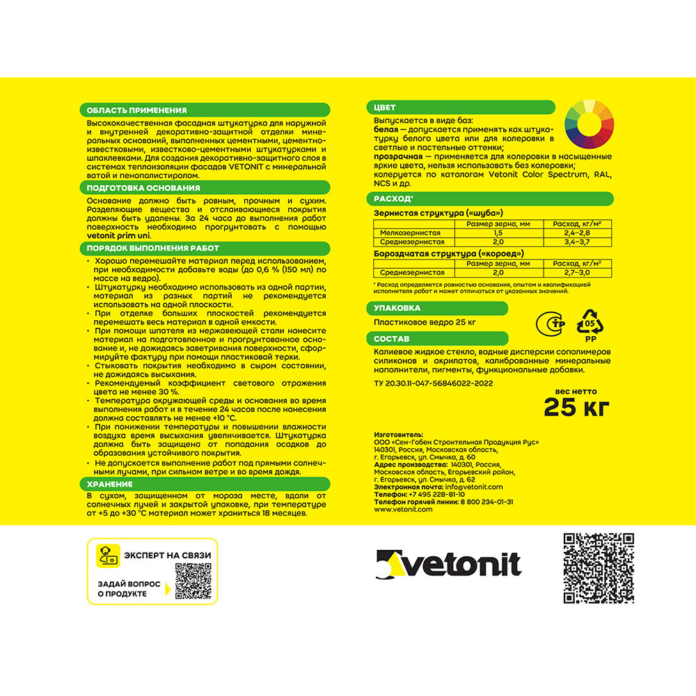 Готовая к применению силикатно-силиконовая полимерная декоративная штукатурка. Подходит для создания декоративно-защитного слоя на поверхности теплоизоляционных фасадных систем. Образует борозчатое покрытие «короед/барашек». Подходит для внутренних и наружных работ. Долговечная, обладает эффектом самоочищения, высокой стойкостью к образованию грибков и плесени. Легка в работе, подходит для механизированного нанесения. Не требует последующей окраски, так как колеруется в массе. Перед применением необходимо загрунтовать поверхность при помощи Vetonit prim uni.