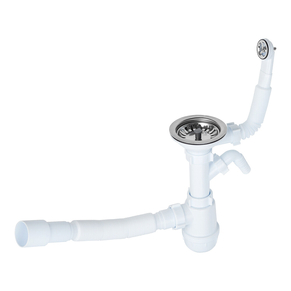 Комплектация: сифон с отводом, выпуск, сетка пробка, перелив прямоугольный и круглый, гибкое соединение.