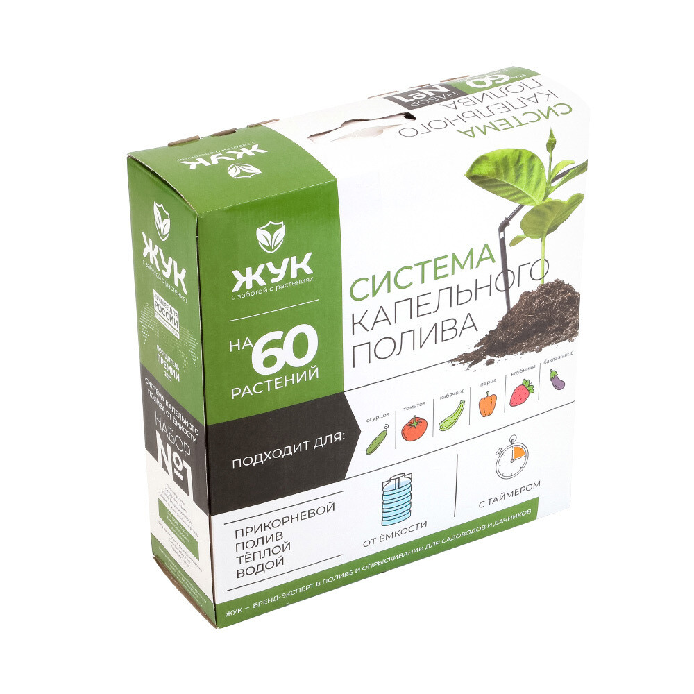 Капельный полив Жук от емкости 60 растений с таймером — готовый набор для полива растений в парниках и теплицах, а также на открытом грунте. Система идеально подходит для помидоров, перцев, огурцов, баклажанов. Для них обязателен не только уход и температурный режим, но и качественный полив. Система разведения капельниц на гибких шлангах обеспечивает бережный полив прикорневой зоны за счет дозированной подачи теплой воды из бочки.