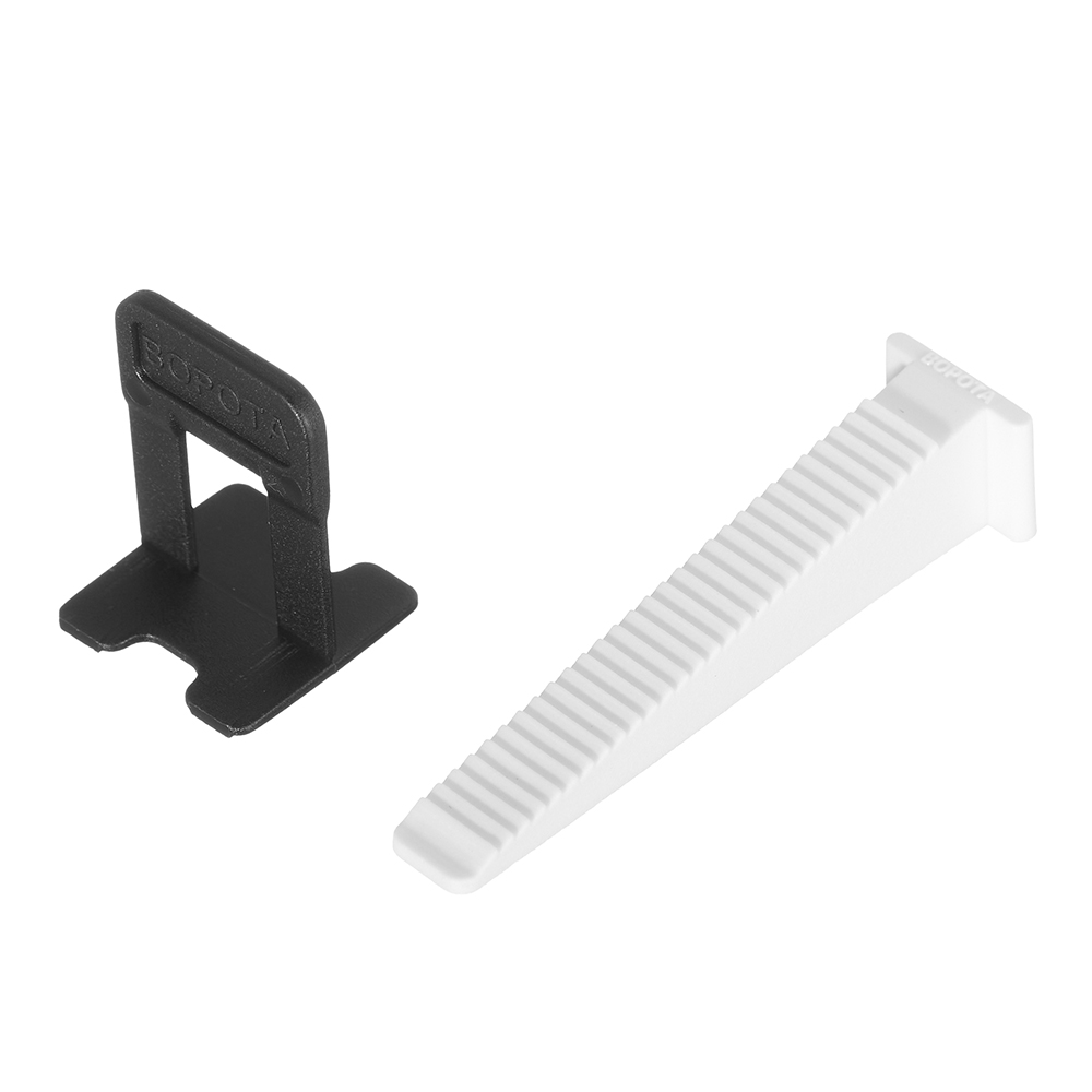 Система выравнивания плитки состоит из двух элементов: клин и зажим. Зажим – размещается снизу под боковыми кромками двух соседних плиток, клин — прижимает две смежные плитки, с целью придания им одного уровня. В данном наборе 40 зажимов и 40 клиньев. Предназначена для быстрой и качественной укладки плитки толщиной от 4 до 14 мм.