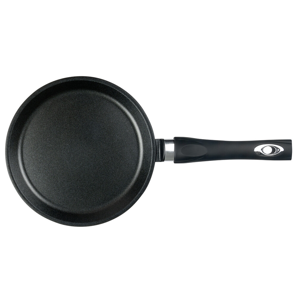 «Классик» — базовая коллекция с однотонным черным покрытием. Трехслойное антипригарное покрытие гарантирует долгий срок службы и качественное приготовление блюд. Литой пищевой алюминий — без канцерогенных веществ и посторонних запахов. Материал долговечный, не поддается деформации. Толстые стенки и утолщенное дно обеспечивают равномерное распределение тепла. Сковородка с антипригарным покрытием на водной основе без вредных химических соединений экологична и безопасна. Процесс готовки может протекать без добавления масла. Гладкая поверхность — залог легкого мытья как вручную, так и в посудомоечной машине. Эргономичные ручки сковородок из бакелита не нагреваются, а благодаря покрытию софт-тач не выскальзывают из рук.
