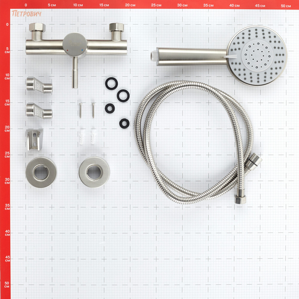 Смеситель, монтажный комплект, душевой шланг, ручная лейка, держатель, инструкция по эксплуатации с гарантийным талоном.