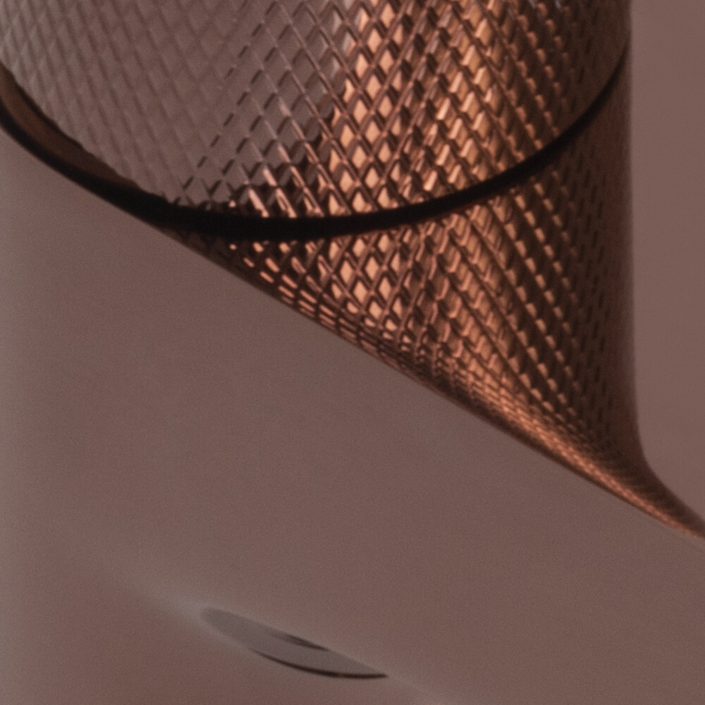 Asphe 7758 Thermo Термостатический смеситель для ванны и душа имеет PVD-покрытие «розовое золото», которое помогает защитить поверхность изделий от воздействия внешней среды.
