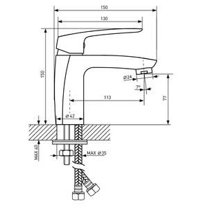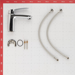 Комплектация: Смеситель в сборе, круглая уплотнительная прокладка, скоба фиксирующая металлическая с резиновым уплотнителем, крепежный шток с гайкой – 2 шт, гибкая подводка 40 см 1/2″х М10 — 2 шт.