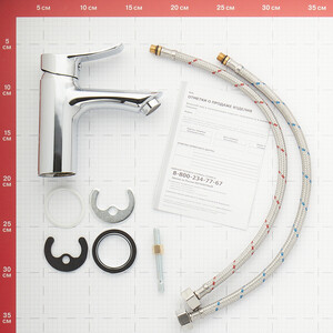 В комплектацию входит: смеситель, гибкие подводки – 2 шт., крепление, инструкция по монтажу и эксплуатации, гарантийный талон